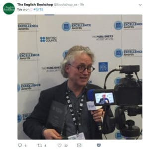 Jan var själv på plats i London tillsammans med Tom Henley som driver The English Bookshop i Stockholm. De rapporterade från prisutdelningen via sociala medier – Twitter (bookshop_se) och Facebook (Uppsala English Bookshop).
