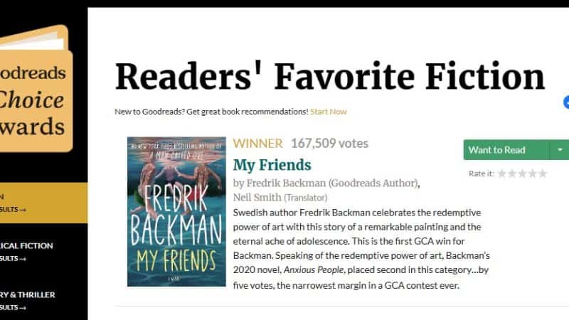 🏆 LÄSARFAVORIT. Fredrik Backmans nya roman Mina vänner ser ut att bli en läsarfavorit. När Goodreads lät sina medlemmar rösta på årets bästa böcker 2025 vann My Friends överlägset i kategorin Fiction med 167 500 röster före tvåan Wild Dark Shore (En vild mörk kust) av Charlotte McConaghy på 107 000 röster. Vinnare bland debutanterna blev Alchemised av SenLinYu. I kategorin Mystery & Thrillers var det jämnare. Flest röster fick Not Quite Dead Yet av Holly Jackson,